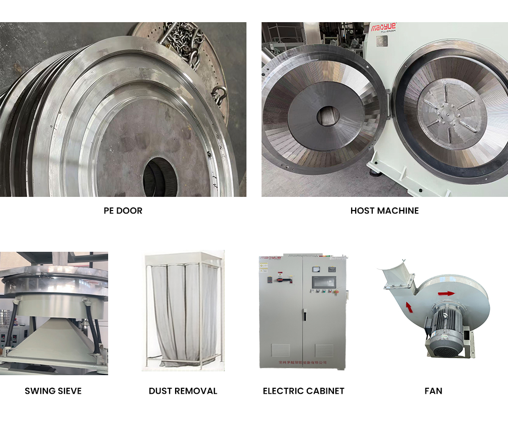 Будучи флагманом сверхвысокой мощности и для тяжелых условий эксплуатации, модель 800 занимает площадь около 8–12 м² при общей мощности 75–110 кВт—, что значительно удваивает производительность модели 600 и делает ее мощным двигателем для крупных заводов по производству мастербатчей/модифицированных пластмасс; он оснащен усиленной двойной системой охлаждения (рубашка водяного охлаждения большой площади + многоступенчатое принудительное воздушное охлаждение) в сочетании с многоточечным интеллектуальным управлением ПЛК и защитой от перегрева, точно поддерживая температуру камеры измельчения на уровне 50–70°C для полного устранения рисков перегрева, прилипания и деградации во время массовых производственных циклов; Полностью закрытая конструкция промышленного воздушного потока с отрицательным давлением + высокоэффективный импульсный рукавный пылеуловитель обеспечивает практически нулевой выброс пыли со степенью улавливания пыли >99,9%, полностью отвечая самым строгим экологическим стандартам для крупных заводов, гарантируя отсутствие пыли в цехе и отсутствие отходов сырья.