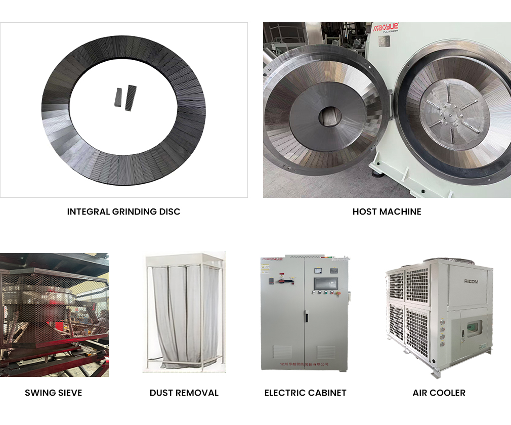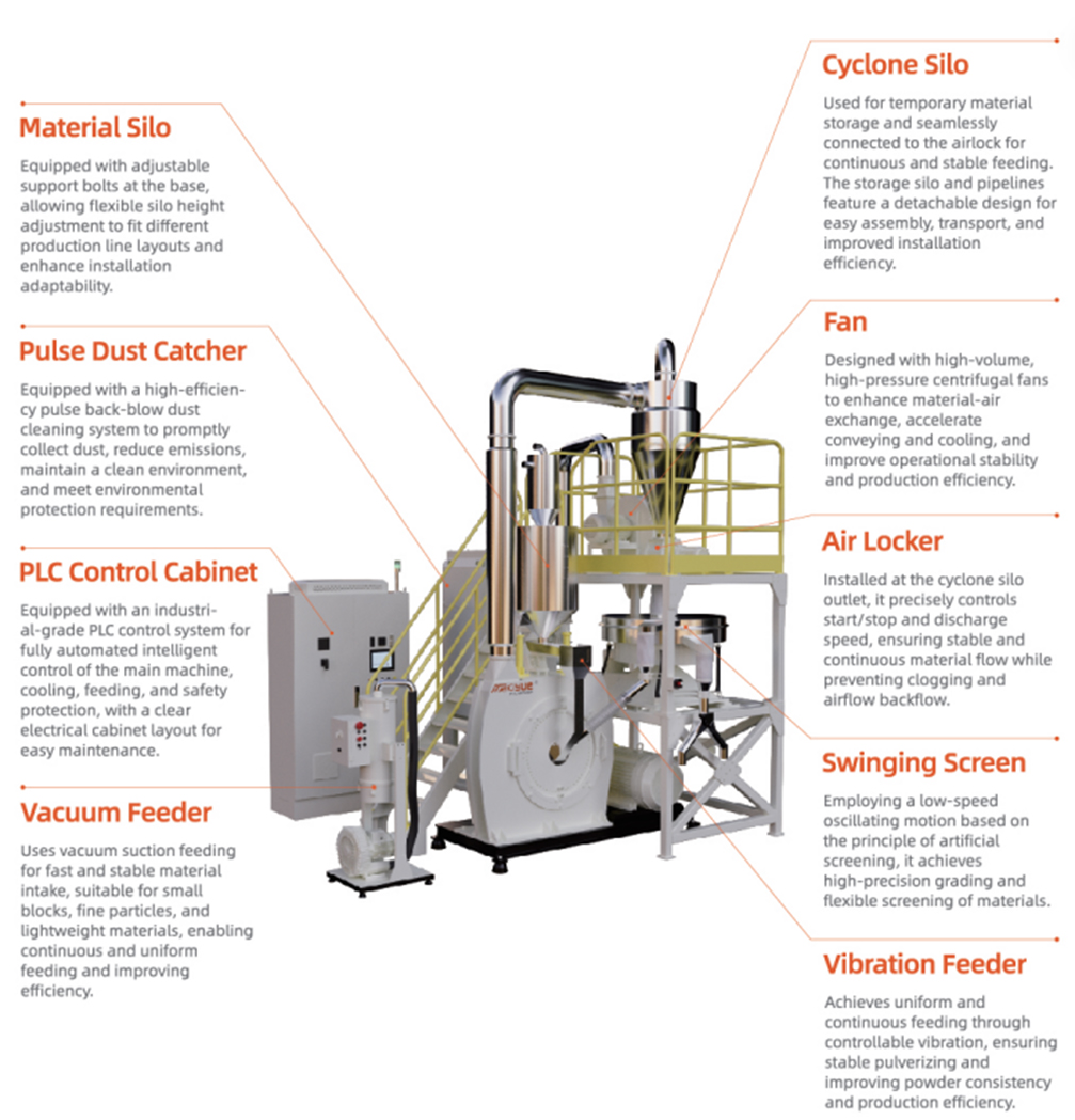 В шлифовальном круге используется цементация с закалкой + поверхностное износостойкое покрытие, что дополнительно увеличивает срок службы до 800–1200 часов при обработке материалов с высокой температурой плавления и высокой прочностью, таких как PA66/PA12, при этом интервалы технического обслуживания увеличиваются на 30%. Дополнительный импульсный пылеуловитель и сепаратор металла обеспечивают более высокую чистоту порошка (примеси <50 ppm) и более точный контроль тонкости (гибкий размер ячеек 10–120 меш). Машина имеет умеренные габариты, оптимизированное энергопотребление (общая мощность 70–85 кВт) и обеспечивает соотношение цены и качества в серии. Это основная рабочая лошадка для средних и крупных предприятий по переработке/модификации пластика —более мощная, чем модель 500, и более экономичная, чем модель 800, обеспечивающая идеальный баланс между производительностью, стабильностью и окупаемостью инвестиций.